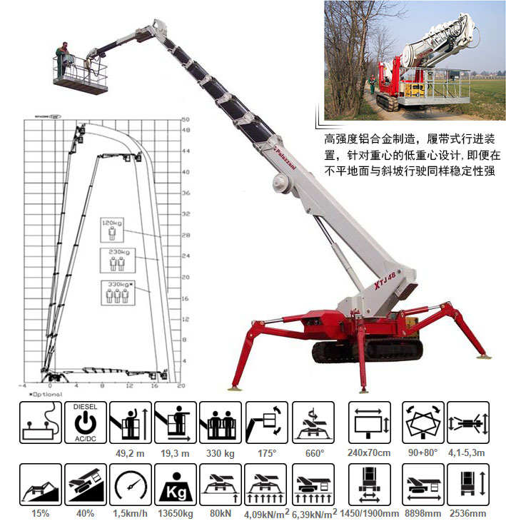 · XTJ48.1蜘蛛式登高車最大行車時速為2.25公里,爬坡能力為25%。